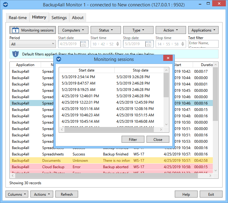 Aside realtime monitoring, the Backup4all Monitor can store historical details for every action that ran on the monitored clients. Each monitoring session contains full details and can be filtered by date/time, statuses, actions and more.